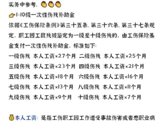 - 一次性伤残补助金:这个是国家规定的,根据伤残等级来,一级伤残能拿到27个月的本人工资,二级25个月,以此类推,十级伤残是7个月的本人工资。(这里的“本人工资”,一般是指工伤前12个月的平均月缴费工资。)