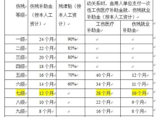 “职工因工致残被鉴定为七级至十级伤残的,享受以下待遇:(一)从工伤保险基金按伤残等级支付一次性伤残补助金,标准为:七级伤残为13个月的本人工资……(二)劳动、聘用合同期满终止,或者职工本人提出解除劳动、聘用合同的,由工伤保险基金支付一次性工伤医疗补助金,由用人单位支付一次性伤残就业补助金。”